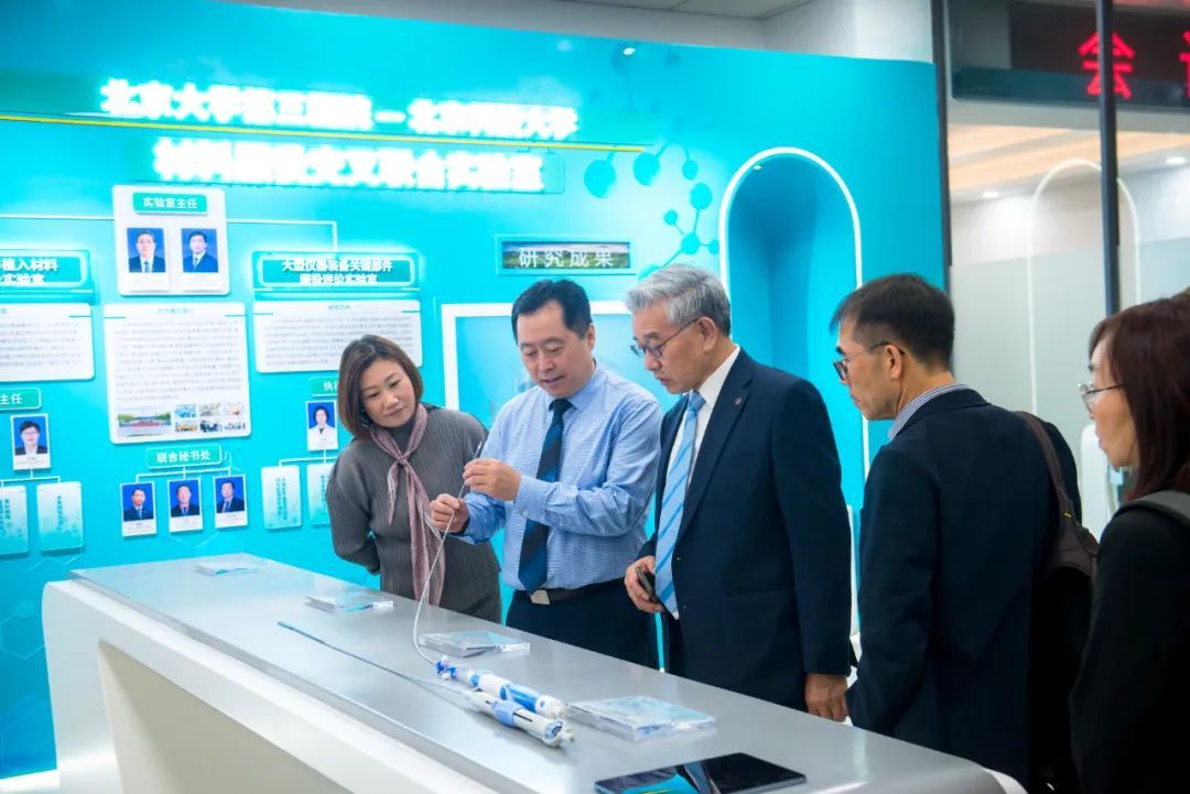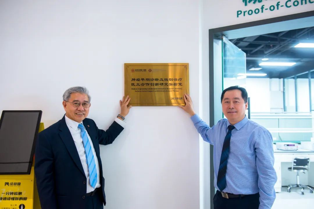 参观结束后,原春辉主任与文効忠院长共同为“肿瘤早期诊断及微创治疗医工合作创新研究实验室”挂牌,实验室占地200平方米,配备有数字PCR仪、超速离心机、激光扫描共聚焦显微镜、实时高内涵细胞成像分析系统筹细胞生物学及分子生物学重点设备,以及加工车床、三色3D打印机、力学试验机、6%鲁尔接头标准测试仪、接触角测量仪、钻孔机以及IVD实验等先进医疗器械加工、检测设备,可开展基础医学实验、样品加工、拉力与耐受力、产品表面性能、密闭性测试等多方面工作。北京大学第三医院与香港理工大学的合作从一月份备忘录的签署到今天联合实验室的建立,层层推进,共同促进医学临床问题与工程技术解决方案的双向赋能,加速智慧医疗技术攻关与临床应用,从而共同推动医疗健康产业的智能化变革,将为健康中国建设注入创新动能。