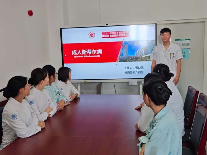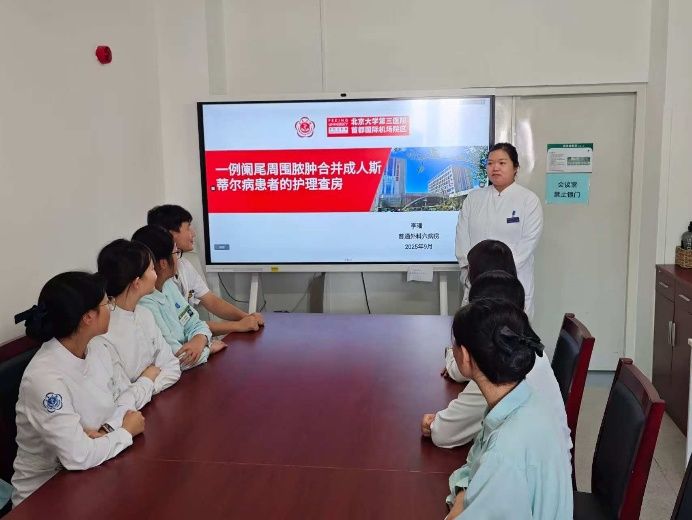 本次联合护理查房以“一例阑尾周围脓肿合并成人still病患者的护理”展开学习及讨论。首先,由普外科执行层护士张益森做《成人still病的护理》授课汇报,课程内容涵盖still疾病概述、病因及流行病学,临床表现,鉴别诊断,对于轻、中、重度still疾病患者的治疗及护理做了详细介绍。作为罕见病,通过以上理论授课,为以专业为引导的护理提供了更好的理论基础。接下来主管层护士徐悦对《肠瘘患者围术期的护理》进行理论授课,围绕消化系统解剖、肠瘘定义及临床表现、辅助检查及治疗、围术期的护理、术后常见并发症及出院宣教等内容展开学习。主管护士李璠同时结合本病例成人still患者发现阑尾周围脓肿后相关治疗及护理展开护理查房授课,生动讲述了患者的发病过程、鉴别诊断、治疗及护理,通过术前术后相应护理诊断及护理措施展开学习及讨论。