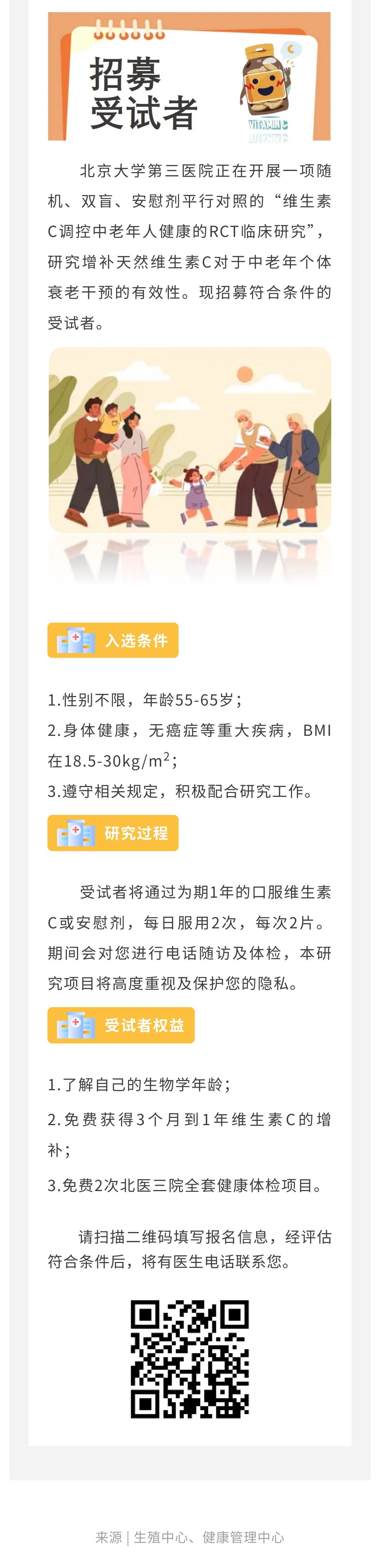 通知|招募中老年健康人群口服维C抗衰老研究受试者啦!