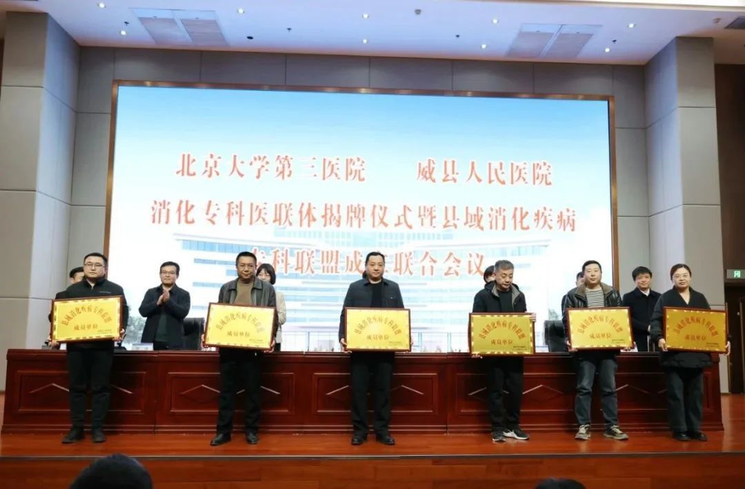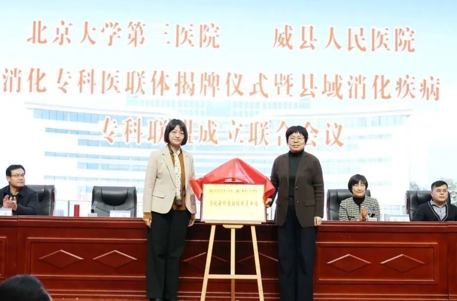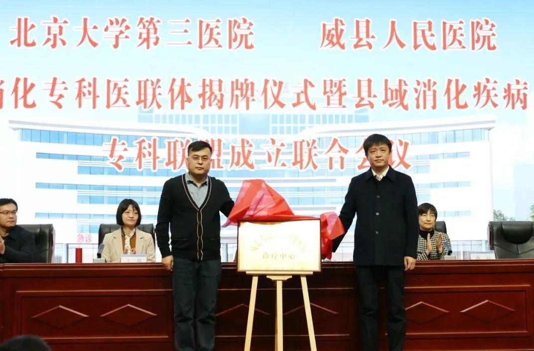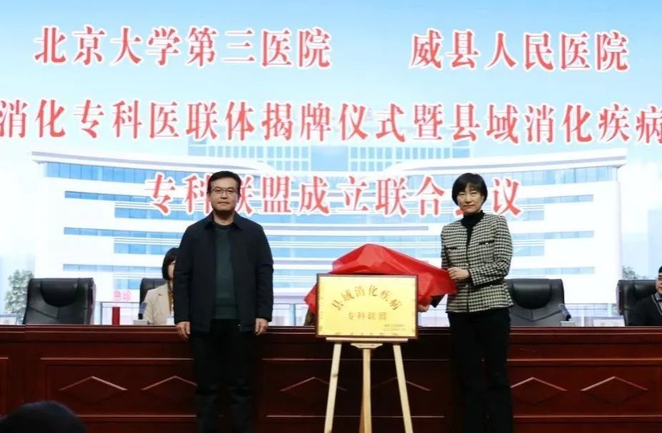 王琨与石慧敏共同为“北京大学第三医院消化专科威县人民医院医联体”揭牌;高云与李锋共同为“县域消化疾病专科联盟”揭牌。