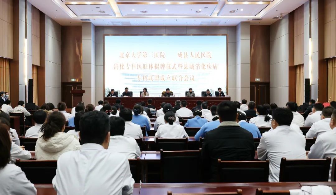 为进一步提升县域消化系统疾病诊疗技术水平,推动优质医疗资源下沉,12月22日下午,威县人民医院与北京大学第三医院消化专科医联体揭牌暨县域消化疾病专科联盟成立仪式在县医院隆重举行。北京大学第三医院王琨博士、河北医科大学第二医院马利锋教授,威县县委常委、统战部长石慧敏,挂职副县长高云、县卫健局局长李锋、县医院党委书记王智健出席仪式。北医三院专家组、县医院消化疾病诊疗中心联盟成员单位及全院中层干部等100余人参加仪式。仪式由院党委副书记、院长宋长更主持。