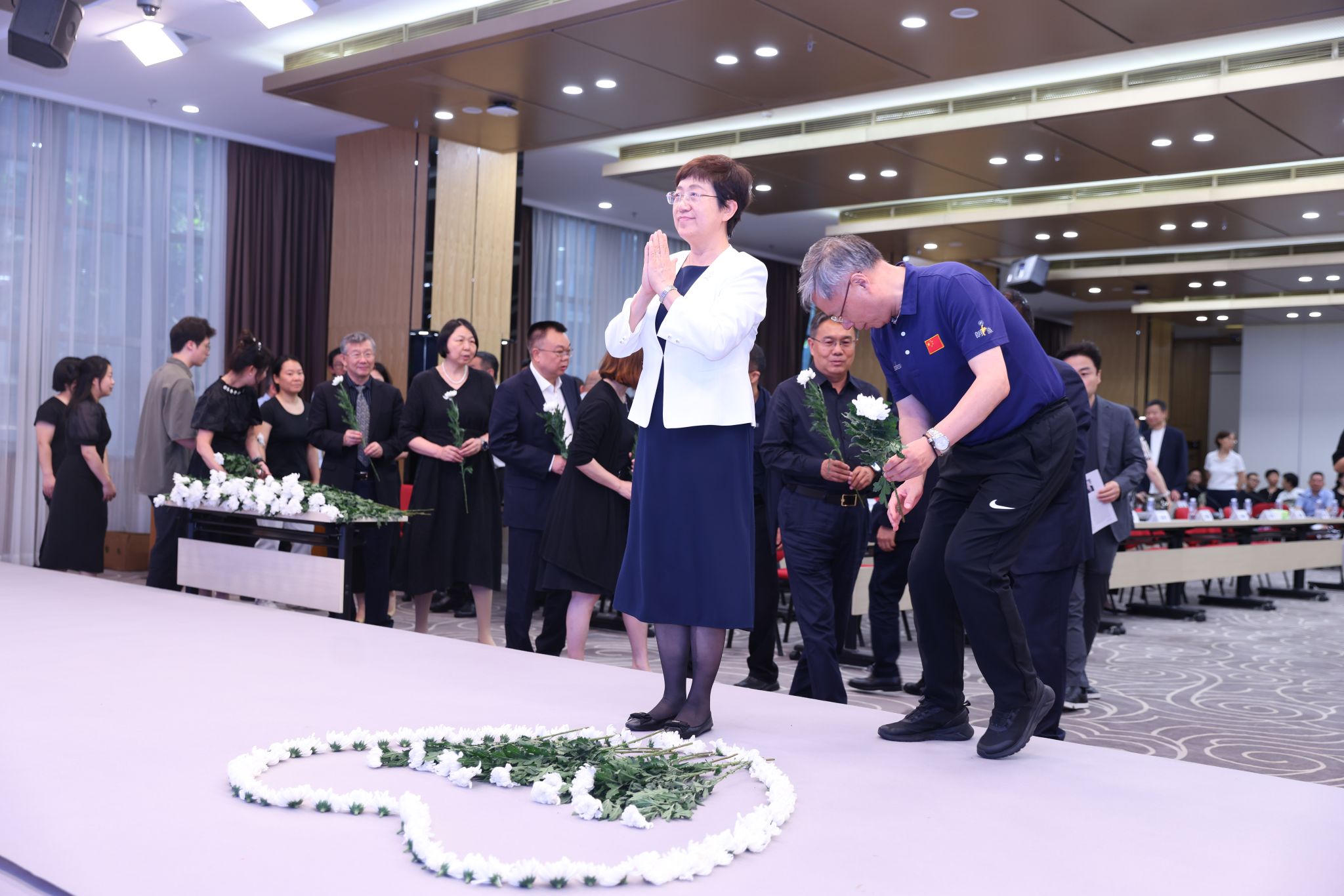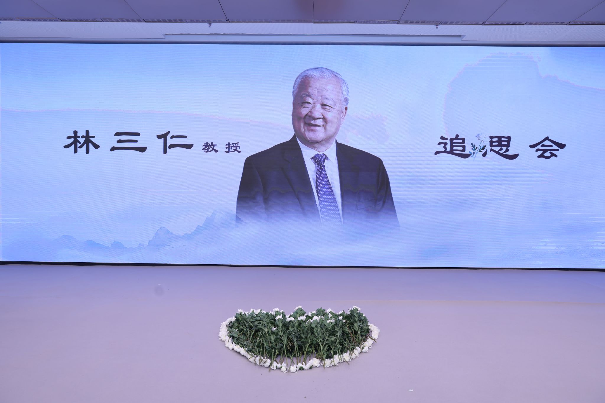 最后,追思会以鲜花告别的方式结束。所有参会人员手持鲜花、依次列队来到林三仁教授画像前,三鞠躬、敬献鲜花,再次表达心中的思念和敬意。