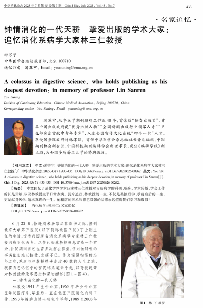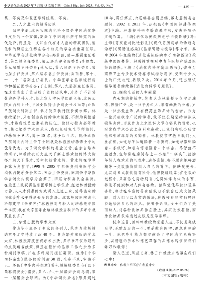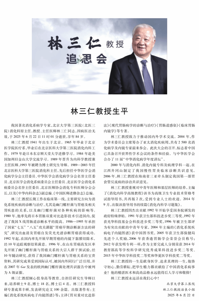 2025年7月29日下午,在北京大学医学部逸夫楼隆重举行缅怀林三仁教授追思会。林教授是我国著名消化系病学专家,北京大学第三医院(北医三院)消化科原主任、教授、主任医师。