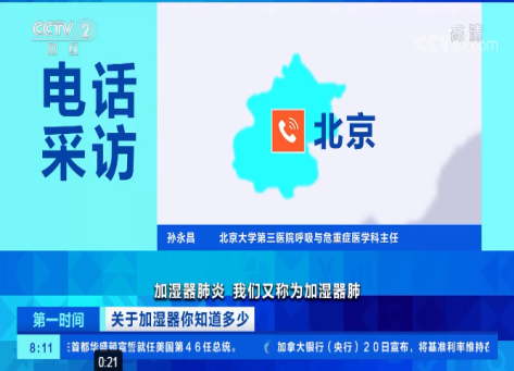 ——(2021年1月21日《CCTV2》第一时间栏目) 呼吸与危重症医学科孙永昌医生科普加湿器使用相关知识。 链接地址:http://tv.cctv.com/2021/01/21/VIDEo33M1gvsewsQsb2Cq0ie210121.shtml