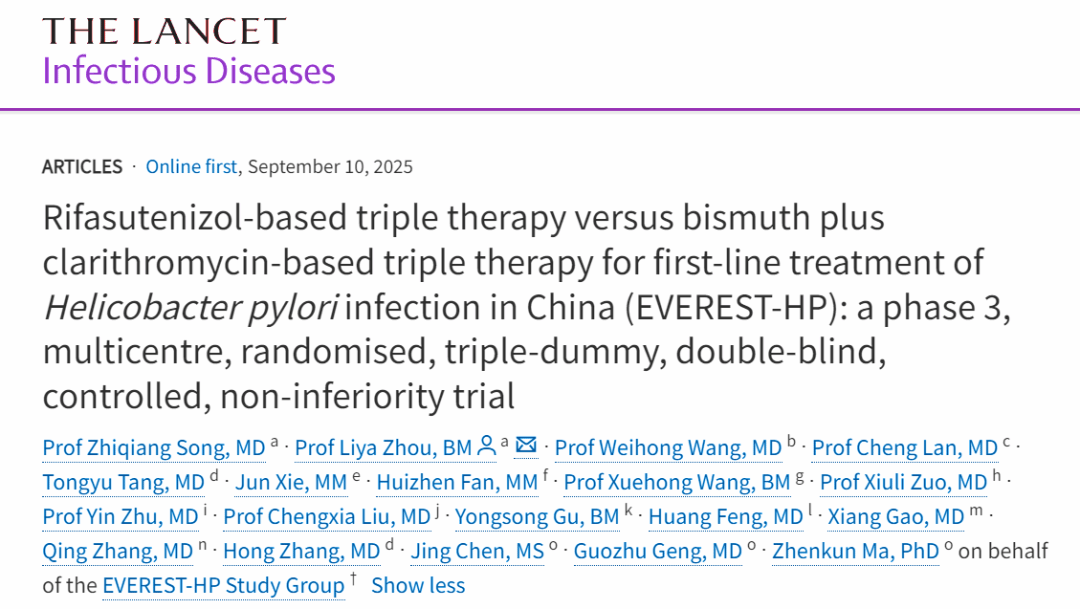 2025年9月10日,北京大学第三医院消化科周丽雅/宋志强教授团队带领全国40家医疗机构消化疾病诊疗中心在感染病学领域顶级期刊《柳叶刀-感染疾病》(The Lancet Infectious Diseases IF: 31.0)在线发表最新研究成果:Rifasutenizol-based triple therapy versus bismuth plus clarithromycin-based triple therapy for first-line treatment of Helicobacter pylori infection in China (EVEREST-HP): a phase 3, multicentre, randomised,...