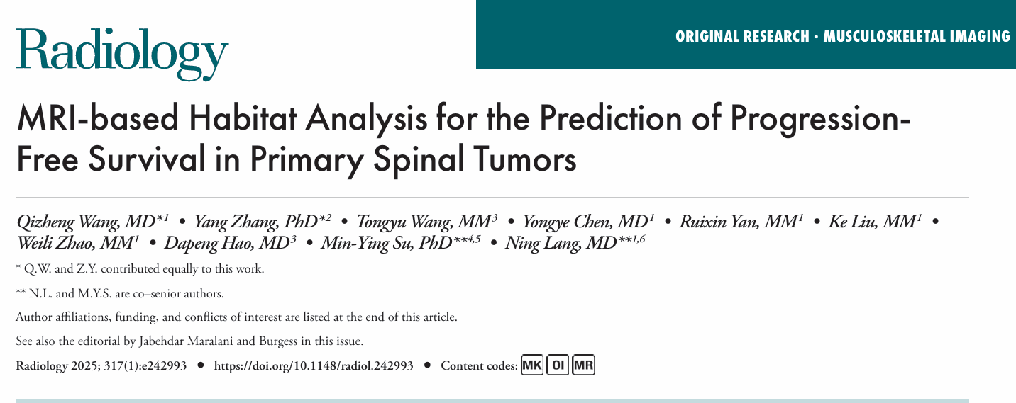 2025年10月28日,北医三院郎宁教授团队在国际权威期刊Radiology (IF 15.2)发表题为“MRI-based Habitat Analysis for the Prediction of Progression-Free Survival in Primary Spinal Tumors”(基于MRI嵌套生境影像分析的原发性脊柱肿瘤无进展生存期预测)的最新研究成果。论文截图肿瘤的显著异质性已被广泛认可,这一特征决定了其复杂的生物学行为与临床预后。脊柱肿瘤作为骨肿瘤中最复杂、最具挑战性的类型之一,其生物学行为高度异质:...