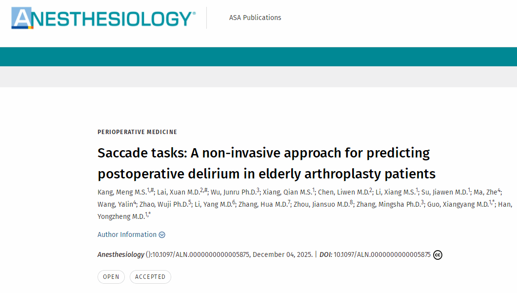 2025年12月4日,北京大学第三医院麻醉科韩永正、郭向阳团队联合北京师范大学张鸣沙团队及多学科力量,在麻醉学领域权威期刊Anesthesiology(《麻醉学》)上发表题为 “Saccade tasks: A non-invasive approach for predicting postoperative delirium in elderly arthroplasty patients”(眼跳任务:老年下肢关节置换患者术后谵妄的无创预测方法)的研究论文。论文截图该研究系统揭示了眼跳任务相关参数在老年下肢关节置换患者术后谵妄(...