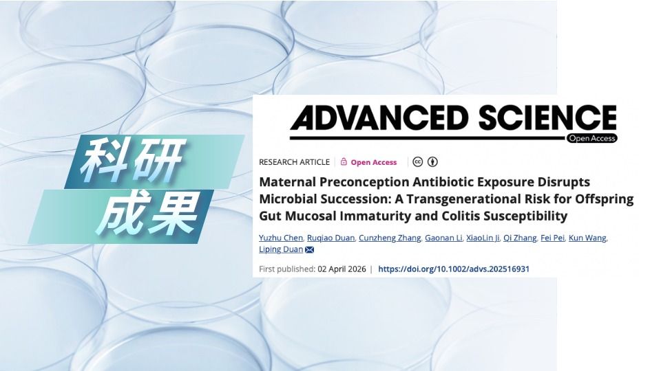 2026年4月2日,北京大学第三医院消化科段丽萍教授团队在Advanced Science(IF:14.1)上发表了题为“Maternal Preconception Antibiotic Exposure Disrupts Microbial Succession: A Transgenerational Risk for Offspring Gut Mucosal Immaturity and Colitis Susceptibility”(母体孕前期抗生素暴露扰乱微生物演替是子代肠道黏膜发育不良及结肠炎易感性的跨代风险因素)的研究成果。论文截图生命早期微生物组在宿主发育和终生健康中起着关键作用。...