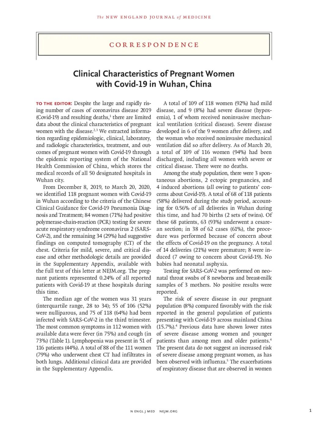 2020年4月18日,北京大学第三医院乔杰、赵扬玉教授团队在国际顶级医学期刊《新英格兰医学杂志》(The New England Journal of Medicine,IF: 70.670)在线以correspondence形式发表了题为“Clinical characteristics...