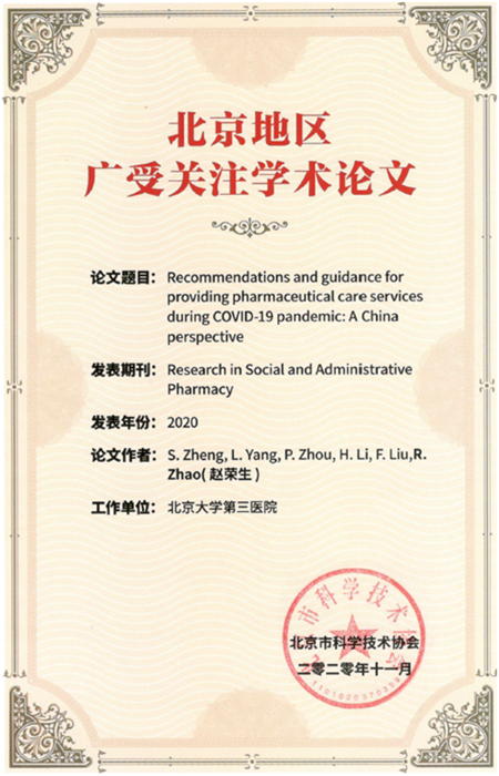 12月3日,由北京市科协主办,北京药学会和北京大学药学院联合承办的北京地区广受关注生物医药论文报告会在北京大学药学院举办。我院药剂科赵荣生教授团队在Research in social and administrative pharmacy发表的论文...