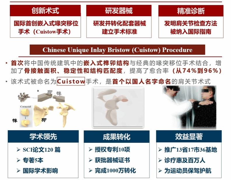 开发了创新手术技术——“嵌入式喙突移位术”。这一创新灵感来自于中国传统建筑的榫卯结构,将其用于喙突移位手术,增加了骨块接触面积、稳定性和结构匹配度,使骨愈合率得到极大改善。这一术式成为首个以中国人名字命名的肩关节脱位手术,Cuistow手术。