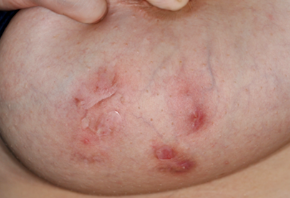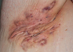 这是一种大汗腺(顶泌汗腺)慢性化脓性炎症,主要发生于腋窝、腹股沟、肛周、生殖器区、乳房下等处,初起为疼痛性的皮下炎性结节,反复破溃后形成窦道和溃疡,可渗出恶臭的脓液。病变区域常常能看到双头或多头的粉刺,这是诊断该病的重要线索。