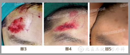 二、另一位额头挫裂伤的青少年,伤口不规则,组织糟烂挫伤重(图3)。我们与家长沟通后,进行了精细的伤口清创处理、肌肉复位、皮下减张缝合及皮缘对合(图4)。拆线后,患者坚持了6个月的防晒和抗疤痕治疗。一年后随访,原受伤处肉眼几乎看不出痕迹(图5)。