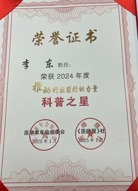 近日,第十届医学家年会在京举行。会上,由《医师报》举办的“推动行业前进的力量-科普之星”评选活动公布结果。中医科主任李东教授荣获“2024 年度科普之星”荣誉称号。