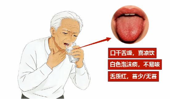 症状:咽痛,伴口干舌燥、喜饮凉液,咳嗽咯白色泡沫黏痰,痰不易咯出,此为该证核心表现。舌质红,苔少或无苔,脉象细滑。