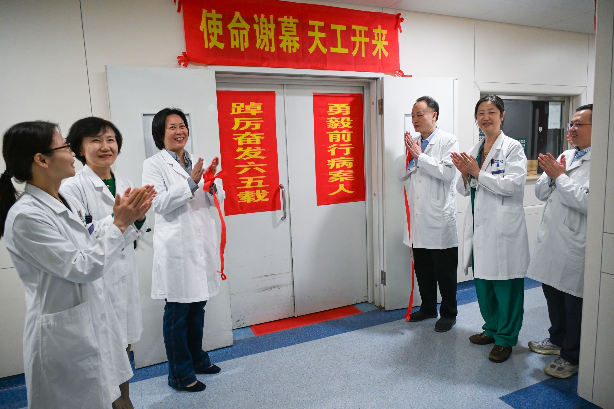 仪式的最后,陈剑铭主任邀请全体参会人员移步至门诊病案科大门外合影留念。合影后,进行摘牌仪式。北医三院李蓉副院长和病案科陈剑铭主任拉动红绸,“使命谢幕,天工开来”的条幅缓缓落下,遮住了“门诊病案科”科牌,随后内外两道大门缓缓关闭,里道门写着:踔厉奋发六五载,勇毅前行病案人。见证门诊病案工作的历史。外道门写着:守正创新,勇往直前。表达门诊病案人不忘初心,再创辉煌的决心。