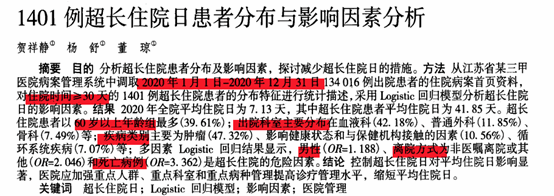 某医院在分析超长住院患者分布及影响因素中,从病案首页中提取住院时间≥30天的超长住院患者进行统计分析,得出控制加强超长住院日对平均住院日的影响显著,加强重点人群、重点科室和重点病种的管理,缩短平均住院日的建议。