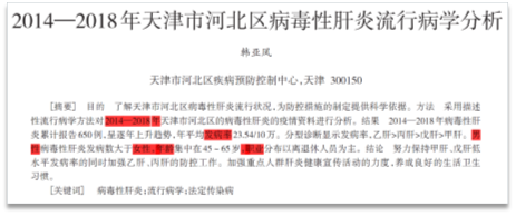 传染病研究案例:以病毒性肝炎为例,某文献针对2014—2018年天津市河北区的肝炎病例展开分析,研究所需的时间范围、地域范围、疾病类型等基础信息均直接来源于住院病案首页。文献得出的报告病例数、“男性发病多于女性” 的性别差异、高发年龄段分布、不同职业人群发病特点等结论,也可通过首页数据精准提取,为区域肝炎防控策略制定提供参考。