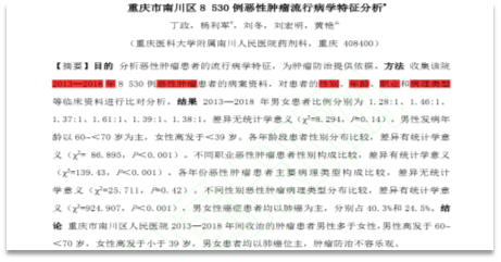 慢性病研究案例:某院围绕2013—2018年住院恶性肿瘤患者的病案资料开展研究,通过住院病案首页提取患者性别、年龄、职业、病理类型等核心信息,经比对分析明确了该院恶性肿瘤患者的发病特征,为医院优化肿瘤筛查流程、制定针对性防治方案提供了数据支撑。