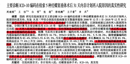 某三甲综合医院提取2008年12月1日-2018年12月30日接受经蝶窦垂体手术且31天内再次入院的患者住院病案首页数据,经分析后得出医师对主要诊断的错误选择和编码员编码错误是影响主要诊断编码反映真实再入院原因的主要问题来源。