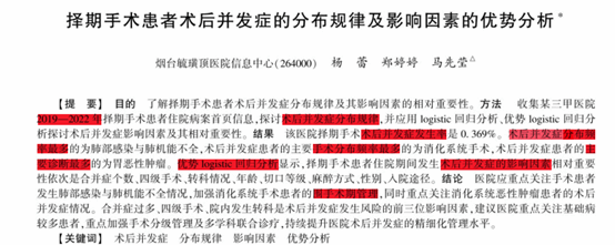 某医院通过logistic回归分析2019—2022年择期手术患者住院病案首页信息数据,讨论术后并发症影响因素,建议重点关注基础病较多患者,重点加强手术分级管理及多学科联合诊疗。