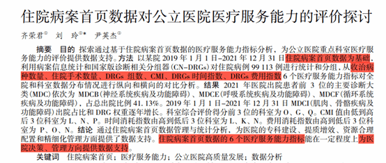 某医院开展住院病案首页数据对公立医院服务能力的评价探讨,基于首页数据、国家诊断相关分组CN-DRGs,从收治病种数量、住院手术数量、DRGs组数、CMI、DRGs时间指数、DRGs费用指数等6个医疗服务能力指标,在一定程度上为医院决策和管理方向提供数据支持。