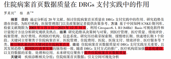某医院通过检索2003年1月到2003年12月的中国知网期刊库文献,得出住院病案首页数据质量对DRGs支付实践至关重要。