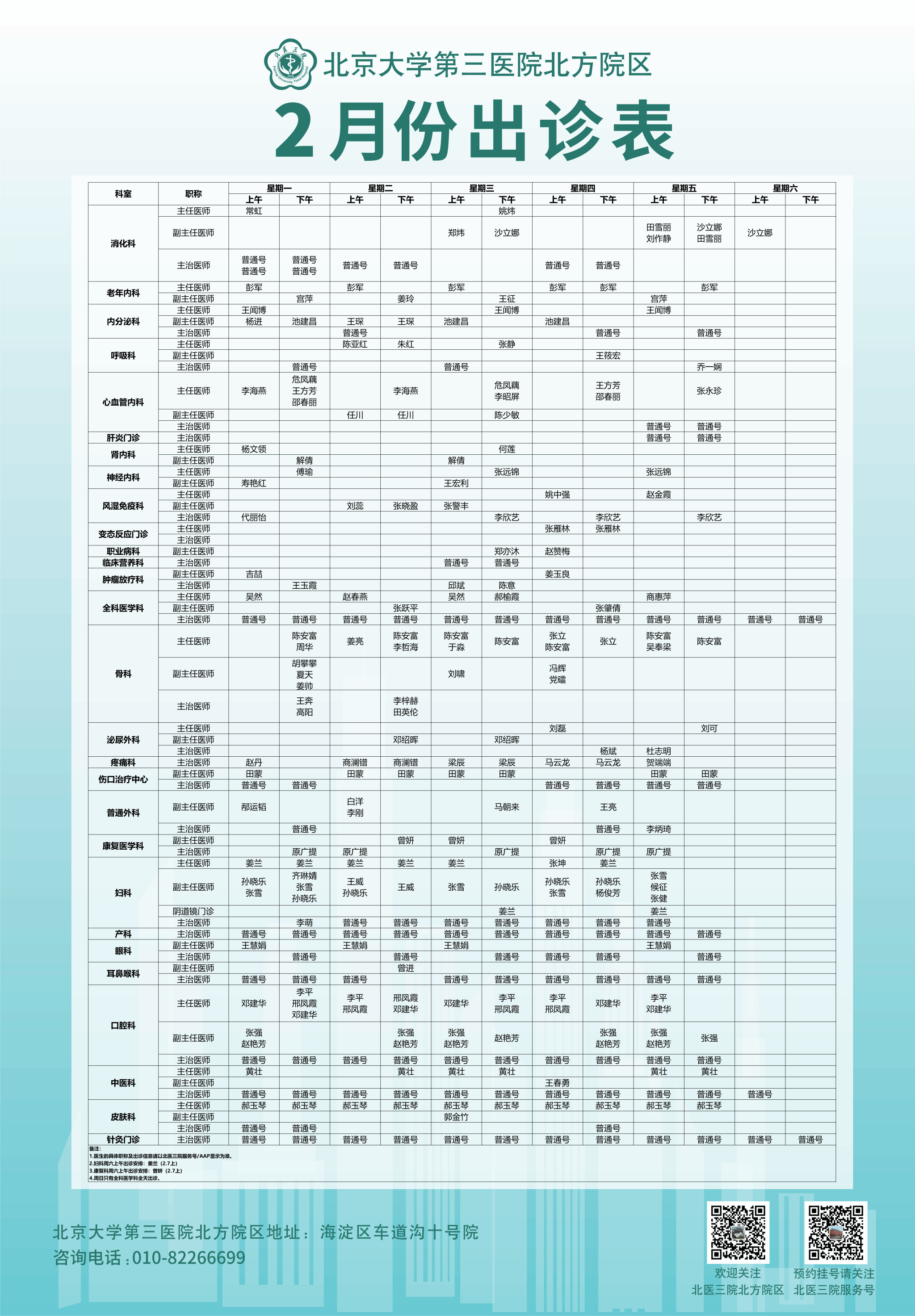 北京大学第三医院北方院区2026年2月门诊安排