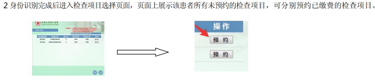②身份识别完成后进入检查项目选择页面,页面上展示该患者所有未预约的检查项目,可分别预约已缴费的检查项目。