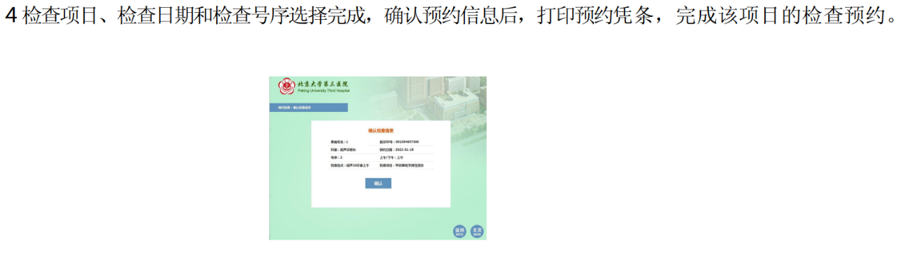 ④检查项目、检查日期和检查号序选择完成,确认预约信息后,打印预约凭条,完成该项目的检查预约。