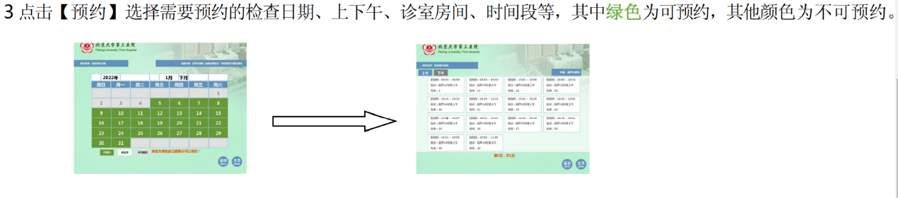 ③点击“预约”选择需要预约的检查日期、上下午、诊室房间、时间段等,其中绿色为可预约,其他颜色为不可预约。