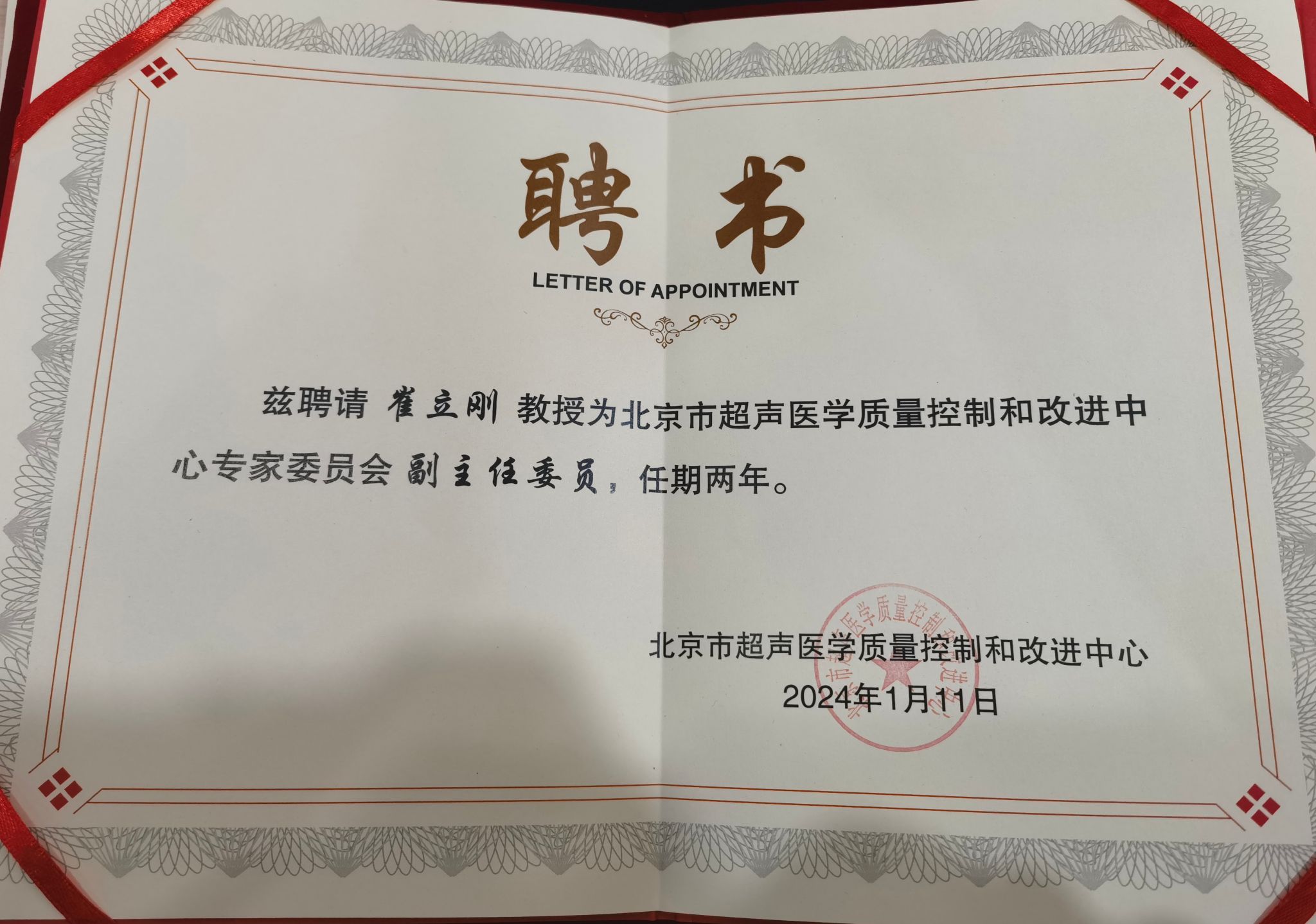 2024年1月11日,北京市超声医学质量控制和改进中心发布了超声医学质量控制和改进中心专家委员会名单。我院超声医学科主任崔立刚教授被聘为北京市超声医学质量控制和改进中心专家委员会副主任委员。崔立刚教授入北京市超声医学质控中心专家委员会,彰显了我院在超声医学专业领域的影响力,我科将为助力北京市各级医疗质量控制中心的建设与管理,提升医疗机构医疗质量与安全水平贡献北医三院人的力量。