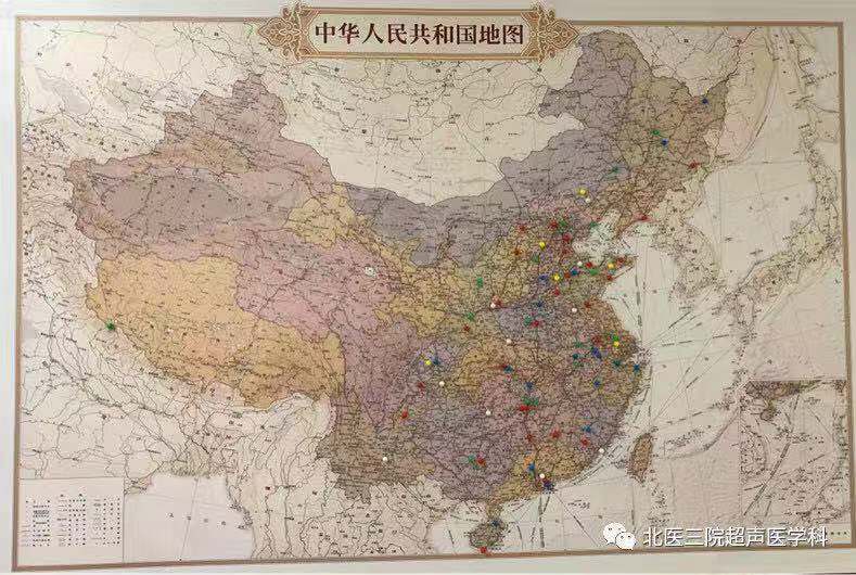 图为北医三院超声科准备的“告诉我你来自哪”环节——鼓励每位前来的进修医师用大头钉标出所在单位的地点