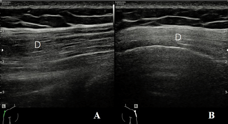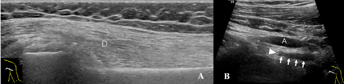病例4:53岁女性左肩关节反复脱位,关节镜复位后左肩无力,持续3个月。A,三角肌(D)萎缩,回声增强。B,腋神经(箭头)位于腋动脉(A)的后方,神经的连续性中断(箭头)。
