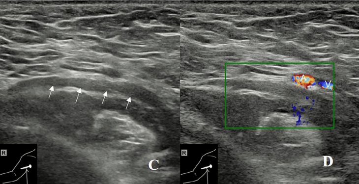 病例2:51岁女性在修复肩袖撕裂后出现右肩活动范围受限,持续2个月。A,左侧三角肌(D)正常。B,右侧三角肌(D)萎缩,回声增强。C,右侧腋神经(箭头)回声减低,弥漫性肿胀。D,彩色多普勒超声显示伴随的旋肱后动脉(A)和静脉(V)。