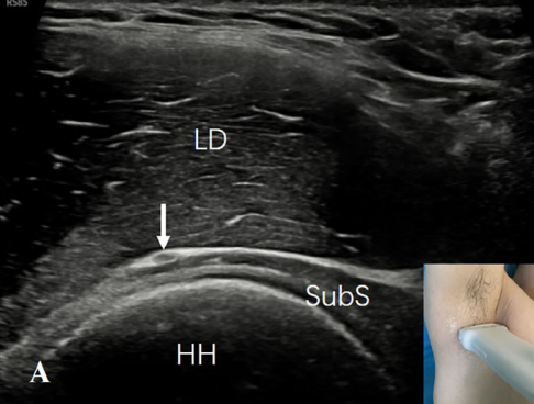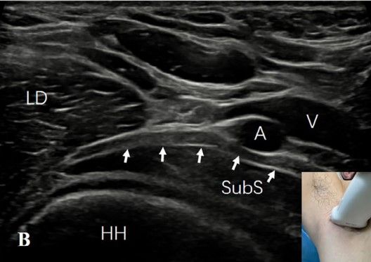 图3A:探头水平放置在肱骨头(HH)上。可见肩胛下肌(SubS)位于肱骨头上方。腋神经(AN)的短轴(箭头)在肩胛下肌(SubS)和背阔肌(LD)之间呈点状低回声。