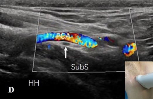 图3D:轻调探头位置,可见后旋肱后动脉(PCA)位于腋神经(AN)(箭头)旁,可追溯至其起源于腋动脉。