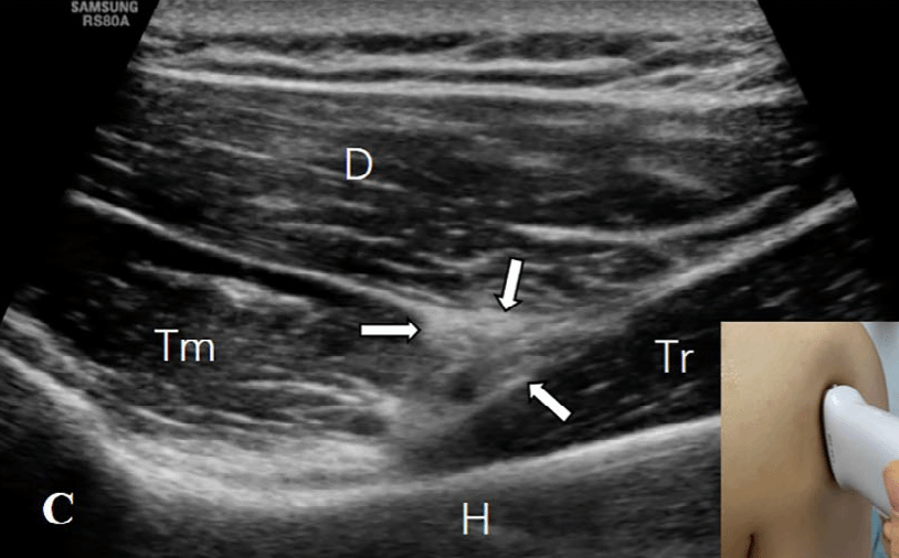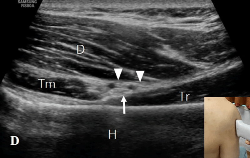 图2C:探头继续向外侧移动,直到出现肱骨干(图1C)。在此切面上,腋神经(AN)和旋肱后动脉(白色箭之间)位于由头侧的小圆肌(Tm)、足侧的肱三头肌长头(Tr)、浅方的三角肌(D)和深方的肱骨干围成的空间内。