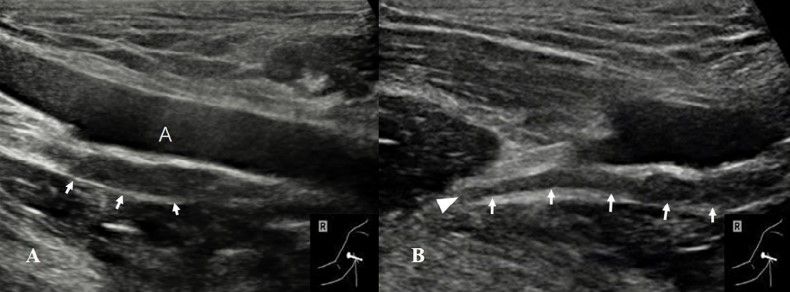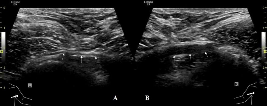 病例1:患者34岁男性,右肩受伤,活动范围受限,持续2个月。A,左侧腋神经(箭头)正常。B,与正常侧相比,右侧腋神经(箭头)回声减低,弥漫性肿胀。