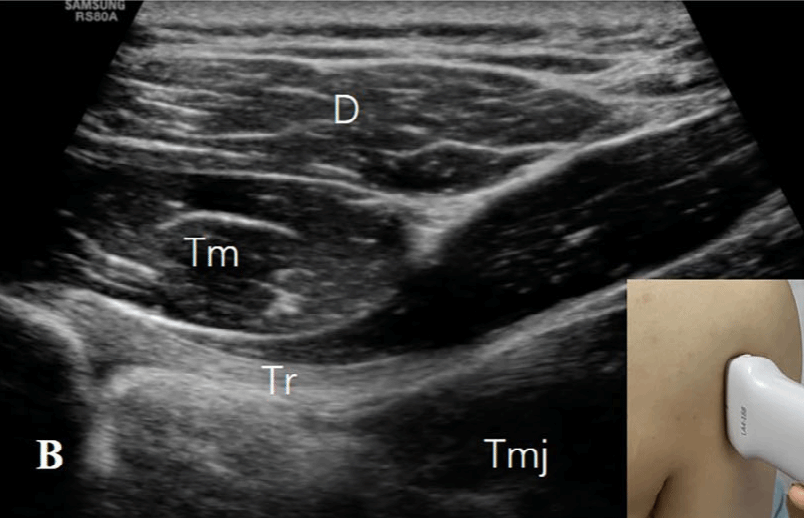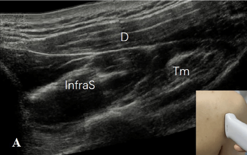 图2A:探头沿着矢状面放置在肩胛骨的外缘和肩胛骨下角下方,以显示冈下肌(InfraS)和小圆肌(Tm)的短轴。三角肌(D)位于冈下肌(InfraS)和小圆肌(Tm)的表面。