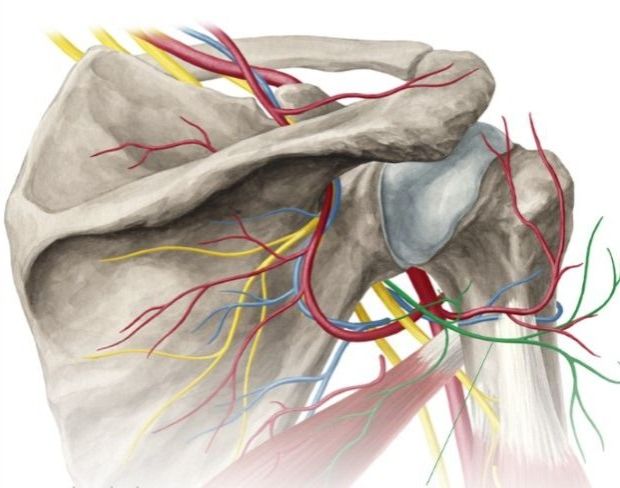 腋神经起源于臂丛的后束,其纤维来自第五和第六颈神经。它位于腋动脉和静脉的后方,沿着肩胛下肌的前面呈斜行走向。在肩胛下肌的下外缘向后弯曲,位于肩关节囊的下方,穿过四边孔,伴随着旋肱后动脉和静脉。行出四边孔后,腋神经环绕肱骨颈部,分为前支和后支,支配小圆肌和三角肌(图1)。