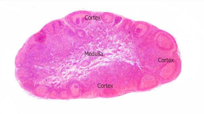 淋巴结是卵圆形或肾形小体,排列在淋巴管的通路上。表面包有结缔组织的被膜,被膜的结缔组织呈放射状分布伸入淋巴结内部形成小梁。内部的实质分皮质和髓质。皮质为淋巴结实质周围部分,由密集淋巴小结组成。髓质是由髓索、小梁和淋巴窦三种结构共同组成。一侧的小凹陷,称为门部,有血管的进出和输出淋巴管。淋巴结周围有多条输入淋巴管进入被膜,开口于被膜下窦(被膜下窦是位于皮质外周的腔隙,淋巴结门部不存在皮质,没有此窦)。大量的皮质淋巴窦从被膜下窦向髓质延伸,在髓质内合并成更大的髓质淋巴窦。后者在门部汇合成输出淋巴管,把淋巴引流出淋巴结。