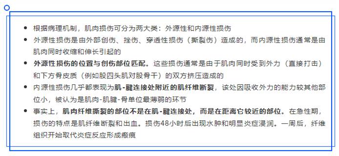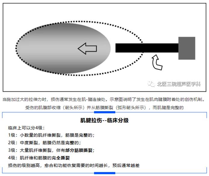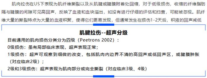 超声损伤1级的2个病例。a、b病例1:股直肌中1/3部分的超声图像,a短轴切面b长轴切面显示一个围绕中心腱的边界不清的高回声区(白箭头),与水肿和出血性改变相关。注意肌肉(箭头)外部的正常表现;c-e病例2:短轴扫查股直肌c近端至e远端的超声切面图像,显示中心腱(直箭头)和邻近的肌纤维(弯箭头)的进行性肿胀和回声减低(白箭头)表现伴随小血肿(星号),说明肌腱拉伤