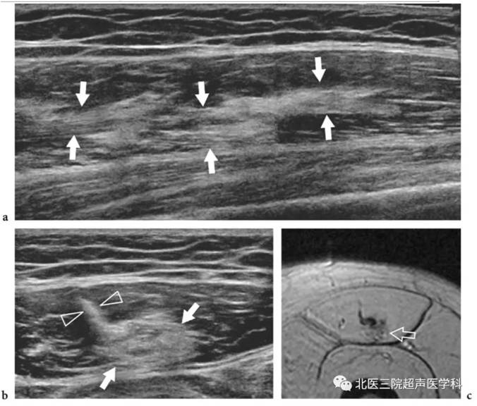 股直肌损伤愈合期(晚期)。患者有股直肌肌腱拉伤史,a长轴宽景成像、b短轴切面,均显示肌肉内中心腱旁的模糊斑点状高回声区,代表残留的瘢痕组织,通常在严重创伤或从事体育活动过早的病例中,c为相应的T2加权轴向的梯度回波成像