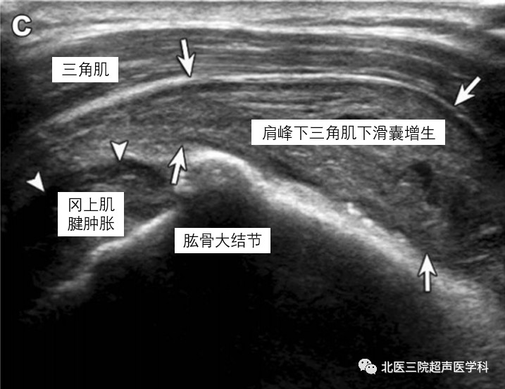 病例3--62岁男性,SASD滑膜增生。冈上肌腱长轴切面显示SASD滑囊扩张,其内填充回声不均的增生滑膜(白箭)。另可见冈上肌腱肿胀、回声减低,呈腱病改变(白箭头)。