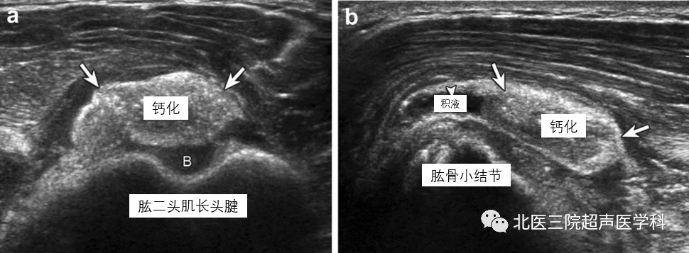 病例5--41岁女性,SASD钙化性滑囊炎。左图:肩关节前方横切面,显示滑囊内积液、钙化。右图:肩关节前方纵切面,显示滑囊内积液、钙化。钙化性滑囊炎通常继发于钙化性肌腱病。