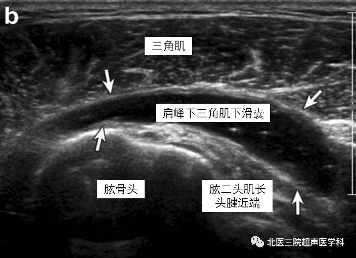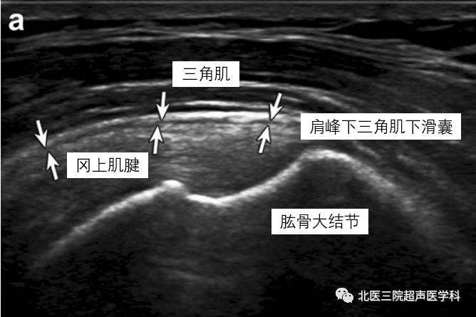 病例1--35岁男性,正常肩峰下三角肌下滑囊(SASD)。冈上肌腱长轴切面显示正常SASD,内可存在极少量无回声液体(白箭),周边是滑囊壁与滑囊周围脂肪的高回声界面。