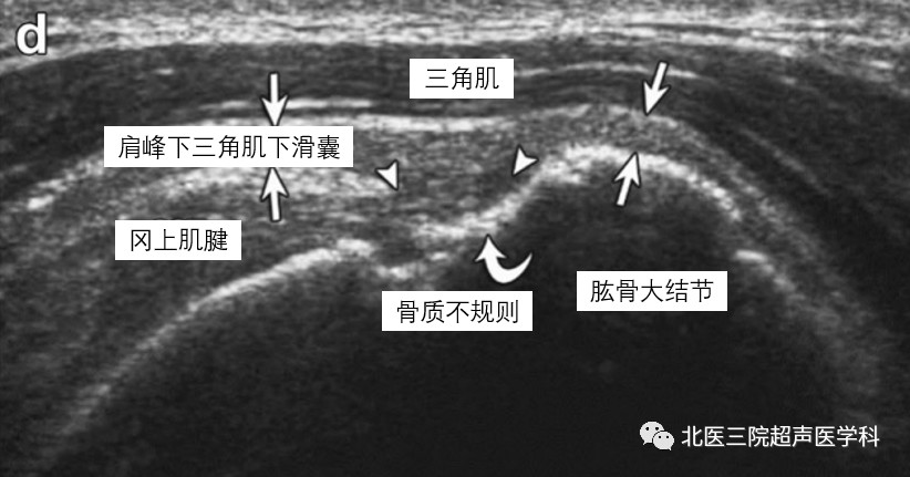 病例4--57岁男性,SASD扩张,冈上肌腱撕裂。超声显示冈上肌腱长轴切面,冈上肌腱滑囊面存在低回声缺损(白箭头之间),肱骨大结节骨质不规则(弯曲箭头),SASD扩张(白箭之间)。