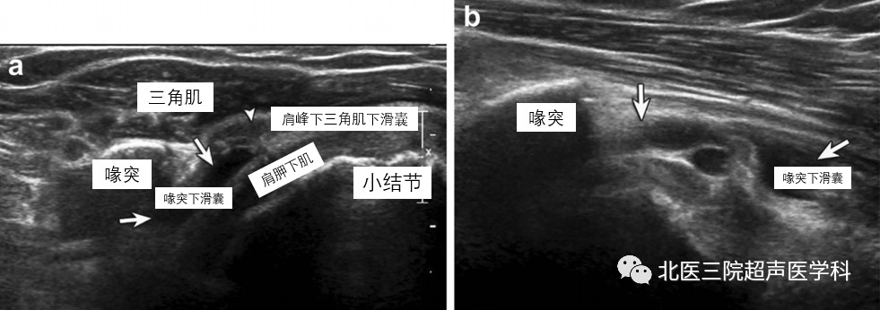 病例7--79岁女性,喙突下滑囊炎。肩关节前方横切及纵切面显示喙突下滑囊内积液(白箭),向喙突深方延伸,位于肩胛下肌腱浅方。
