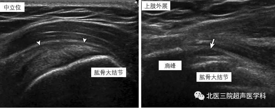 病例6--48岁男性,肩峰下撞击。左图:冈上肌腱长轴切面,上肢中立位,显示SASD轻度增厚(白箭头)。右图:探头置于同一位置,上肢外展位, SASD增厚更为明显(白箭),难以进入肩峰下方,造成外展受阻。